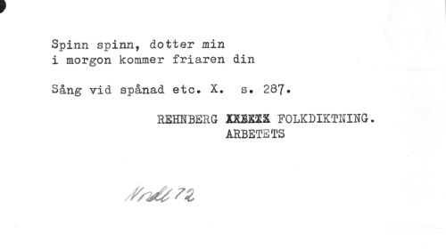 //// Spinn spinn, dotter min i morgon kommer friaren din //// Sång vid spånad etc. X. s. 287. //// REHNBERG JQEXXXX FOLKDIKTNING. //// ARBETETS //// /f/idtn ////