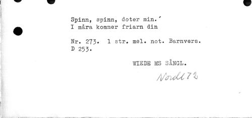 //// Spinn, spinn, doter min.' ^^ I måra kommer friarn din //// Nr. 273' 1 str. mel. not. Barnvers. //// B 253. //// WIEDE MS SÅNGL. //// A/jiM 7 % //// * //// «- ¦ - «¦»--1—->.— 1.; _ ...---—--- ---—___ _ . . .v^w.i-.^___ _ ^/^^»v»! ,/..___..___A___.. . ___jrm-ar»'-i___- ___-___ ___ _ ___ _ _ _ _ ___ . _„ ___ ////