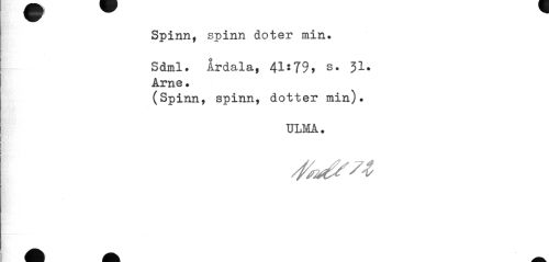 //// Spinn, spinn dottern min» //// Sdml. Ardala, 41*79, s. 31. Arne. //// (Spinn, spinn, dotter min). //// ULMA, ////