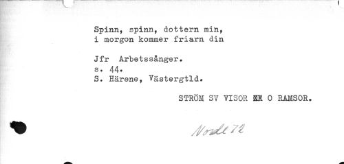 //// ¦ //// Spinn, spinn, dottern min, //// i morgon kommer friarn din //// - //// Jfr Arbetssånger• s. 44» //// S. Härene, Västergtld. //// STRÖM SV VISOR SS 0 RAMSOR. ////