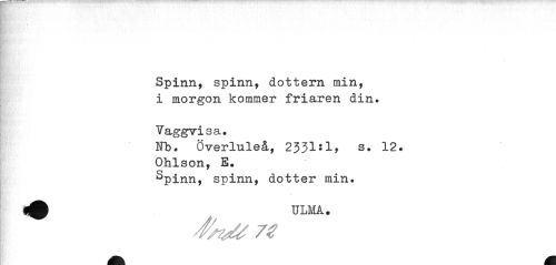 //// ¦ //// »' V i ' . , //// ¦ //// ¦ //// Spinn, spinn, dottern min, i morgon kommer friaren din. //// Vaggvi s a. //// Fb. Överluleå, 2331:1, s. 12. Ohlson, E. //// Spinn, spinn, dotter min. //// ULMA. //// 7 # //// A M ////