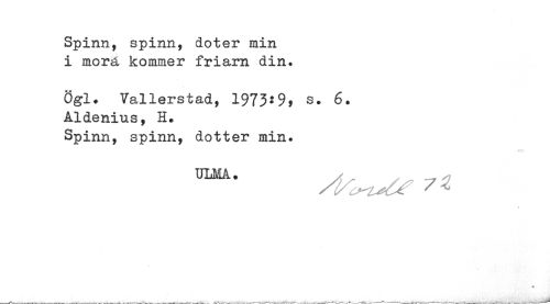 //// Spinn, spinn, doter min //// i morä kommer friarn din. //// Ögl* Vallerstad, 1973*9* s. 6. Aldenius, H. //// Spinn, spinn, dotter min. ////
