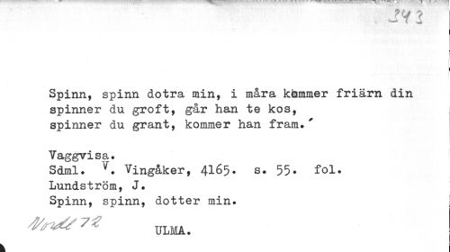 //// a T 2 //// I //// i //// Spinn, spinn dotra min, i måra k&mmer friärn din spinner du groft, går han te kos, spinner du grant, kommer han fram.' //// i //// Vaggvisa. //// Sdml. ¥. Vingåker, 4165. s. 55* fol. //// Lundström, J. //// Spinn, spinn, dotter min. //// S //// ULMA. //// | //// k i ////