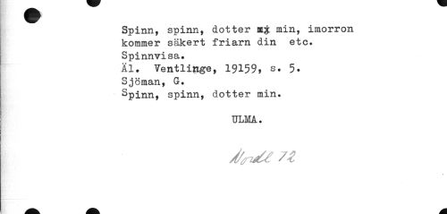 //// Spinn, spinn, dotter m£ min, imorron kommer säkert friarn din etc. Spinnvisa. //// Äl. Ventlirige, 19159, s. 5. Sjöman, G. //// Spinn, spinn, dotter min. //// ULMA. //// « ////