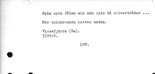 //// Spin spin fålen min män spin då silvertrådar ... När spinnrocken sattes undan. //// Vissefjärda (Sm). 319956. //// LUP. ////