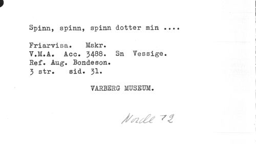 //// I //// Spinn, spinn, spinn dotter min ... //// Friarvisa. Mskr. V.M.A. Acc. 3488. Sn Vessige. Ref. Aug. Bondeson. 3 str. sid. yi. //// VARBERG MUSEUM. //// Afcä^ ^ 1 //// ! ////