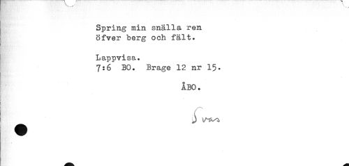 //// ¦'¦-. I- //// Spring min snälla ren of ver berg och fält. //// Lappvisa. //// 7:6 BO. Brage 12 nr 15. //// ÅBO. ////