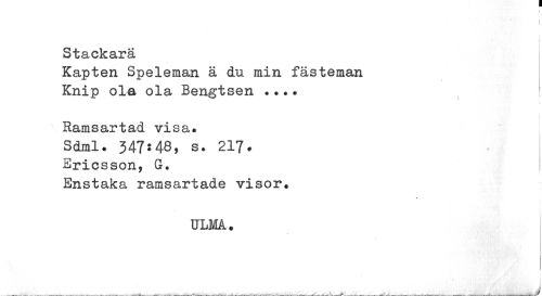 //// ; r //// \ //// Stackarä //// Kapten Speleman ä du min fästeman Knip ola ola Bengtsen .. ?. //// i //// Ramsartad visa. //// Sdml. 347:48, s. 217• //// Ericsson, G. //// Enstaka ramsartade visor. //// ULMA. //// _ . _ ___.. ___J ////