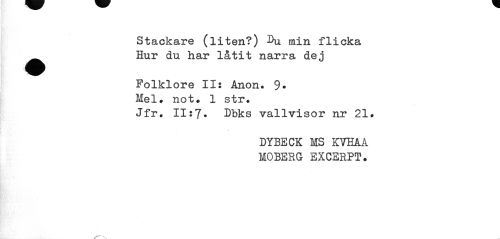 //// Stackare (liten?) Du min flicka ^^ Hur du har låtit narra dej //// Folklore II: Anon. 9* Mel# not» 1 str» //// Jfr. II:7* Dbks vallvisor nr 21. //// DYBECK MS KVHAA MOBERG EXCERPT. ////