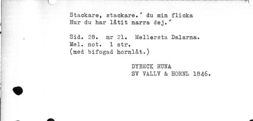 //// Stackare, stackare»' du min flicka Hur du har låtit narra dej.' //// Sid. 28. nr 21» Mellersta Dalarna» Mel. not. 1 str. (med bifogad hornlåt.) //// DYBECK RUNA //// SV VALLY & HÖRNI» 1846. ////