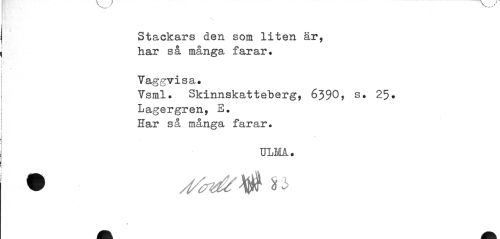 //// Stackars den som liten är, har sa manga //// Vaggvisa» //// Vsml» Skinnskatteberg, 6390, s» 25» //// Lagergren, E» //// Har så många farar. //// ULMA. //// 0 ////