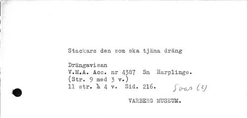 //// Stackars den som ska tjäna dräng Drängavisan //// V.l/UA. Acc. nr 4387 Sn Harplinge. (Str. 9 med 3 v.) //// • 11 str. a 4 v. Sid. 216. J [IJ //// c //// VARBERG MUSEUM. ////