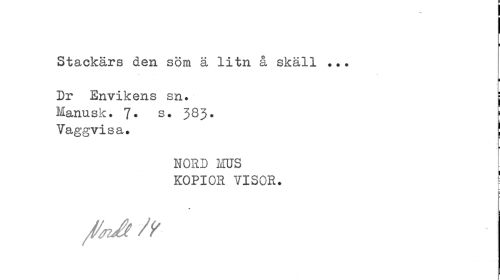 //// Stackars den söm ä litn å skäll ... //// i //// Dr Envikens sn. j //// Manusk. 7» 3Ö3- ^ //// Vaggvisa. //// NORD MUS //// KOPIOR VISOR. | //// //jiA/y ////