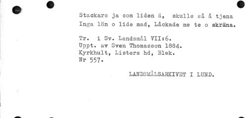 //// ^^ Stackars ja som liden ä, skulle så å tjena //// Inga lön o lide mad, Låckade me te o skrana. //// Tr. i Sv. Landsmål ¥11:6. Uppt. av Sven Thomasson I884. Kyrkhult, Listers hd, Blek. Nr 557. //// LANDSMÅLSARKIVET I LUND. //// t ////