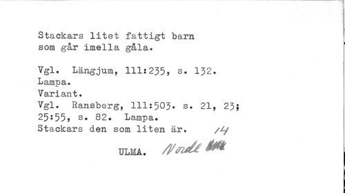 //// Stackars litet fattigt barn som går imella gåla. //// Vgl. Längjum, 111:235* s# 132. //// Lampa. Variant. //// Vgl. Ransberg, 111:503. s. 21, 23; //// 25-55* s» 82» Lampa. //// Stackars den som liten är. /^y //// ULMA. /VMä | ////