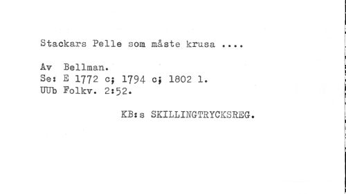 //// Stackars Pelle som måste krusa ___ //// 1 //// Av Bellman. \ //// Ses E 1772 c; 1794 o't 1802 1. [ //// UUb Folkv. 2s52. \ //// \ //// KB:s SKILLINGTRYCKSREG. I //// F ////