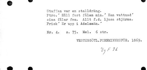 //// Staffan var en stalldräng» Ptro.' Eåll fast fålan min.' Han vattnad' sina fålar fem. Allt f.d. ljusa stjärna. Frisk' Sr upp i Adelsmän.' //// Nr. 4. s. 75. Mel. 6 str. //// VESTERGÖTL. FORNMINIIESFÖR. I869. //// U ////