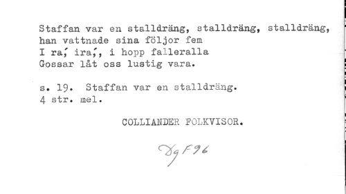 //// Staffan var en stalldräng, stalldräng, stalldräng, han vattnade sina följor fem I ra^ ira,', i hopp falleralla //// Gossar låt oss lustig vara* ! //// s. 19* Staffan var en stalldräng. i //// 4 str. mel. //// COLLIANDER FOLKVISOR. f ////