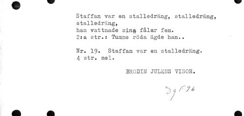 //// Staffan var en stalledräng, stalledräng, stalledräng, //// han vattnade sing fålar fem. 2:a str.: Tumme röda ägde han.. //// Nr. 19* Staffan var en stalledräng. 4 str. mel. //// BRODIN JULENS VISOR. ////