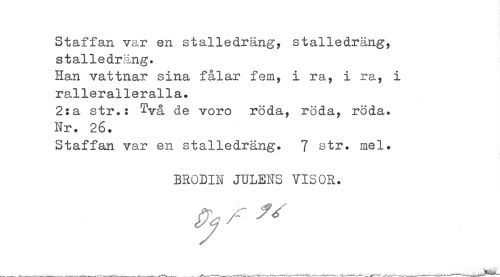 //// Staffan var en stalledräng, stalledräng, stalledräng. //// Han vattnar sina fålar fem, i ra, i ra, i ralleralleralla. //// 2:a str.: ^vå de voro röda, röda, röda. Nr. 26. //// Staffan var en stalledräng. 7 str. mel. //// BRODIN JULENS VISOR. //// tbf" ////