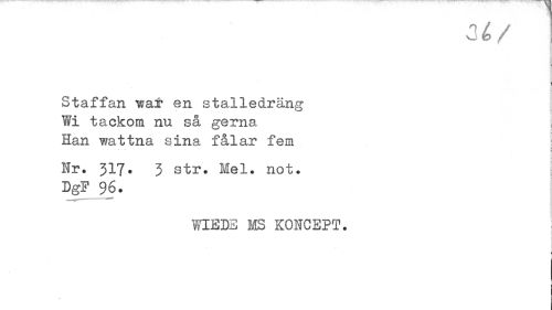 //// / //// Staffan vat en stalledräng Wi tackom nu så gerna Han wattna sina fålar fem //// Nr. 317. 3 str. Mel. not. //// DgF 96. //// WIEDB MS KONCEPT. //// 1 //// t //// i ////