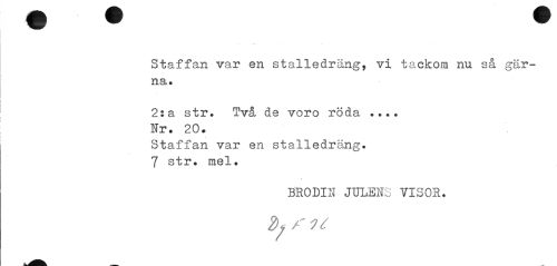 //// Staffan var en stalledräng, vi tackom nu så gärna. //// 2:a str. Två ds voro röda ... Nr. 20. //// Staffan var en stalledräng. 7 str. mel. //// % //// BRODIS JULENS VISOR. 2>< /¦' it ////