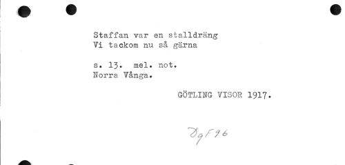 //// Staffan var en stalldräng Vi tackom nu så gärna //// s* 13» mel» not. Horra Vånga. //// GÖTLING VISOR I917. ////
