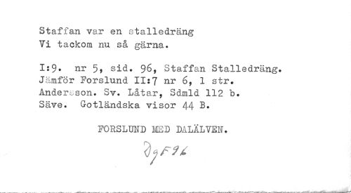 //// Staffan var en stalledräng Vi tackom nu så gärna. //// 1:9* nr 5> sid. 96, Staffan Stalledräng. Jämför Forslund 11:7 nr 6, 1 str. Andersson. Sv. Låtar, Sdmld 112 b. Säve. Gotländska visor 44 B. //// FORSLUND MED DALÄLVEN. ////