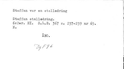 //// Staffan var en stalledräng //// ¦ //// Staffan stalledräng. ' //// 6:2+r. Hl. S.L.S. 367 s. 237-239 nr 65. //// 11. //// ÅBO. //// l ////