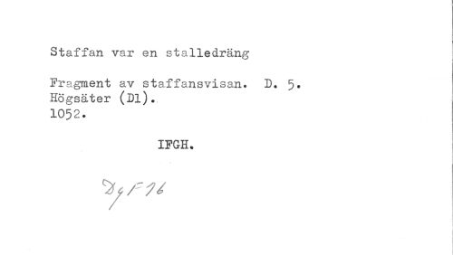 //// Staffan var en stalledräng //// Fragment av staffansvisan. D. 5» Högsäter (Dl).. 1052. //// IFGH. ////