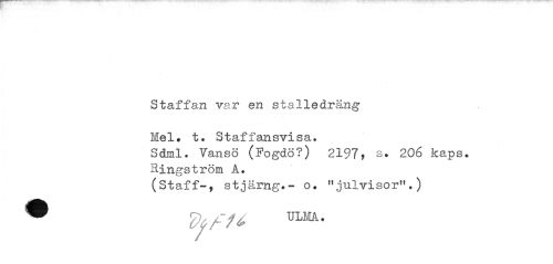 //// Staffan var en stalledräng Mel» t. Staffansvisa. //// Såml. Vansö (Fogdö?) 2197, s. 206 kaps. Ringström A. //// (Staff-, stjärng.- o. "julvisor"?) ////