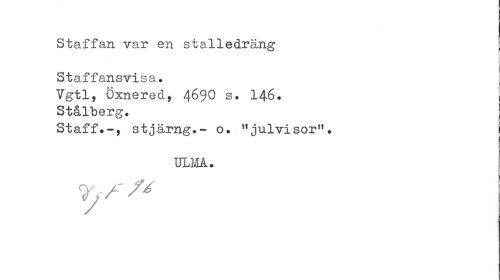 //// Staffan var en stalledräng Staffansvisa. //// Vgtl, öxnered, 469O s. 146. I //// Stålberg. //// Staff.-, stjärng.- o. "julvisor". j //// ULMA. ////