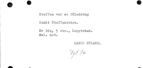 //// v //// Staffan var en fåladräng S ank t S t affan svi s a. //// Nr 264, 5 str., Lappträsk* //// Mel» not. //// LÅGUS NYLAND. ////
