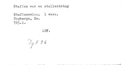 //// Staffan var en stallerdräng //// Staffansvisa. 1 vers. Rogberga, Sm. //// 765.1. //// LUF. //// % f 91 //// — - - —--- _ ___ __ ////