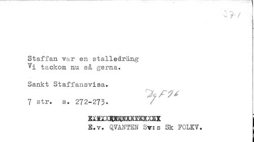 //// ^ > / //// Staffan var en stalledräng tackom nu så gerna. //// Sankt Staffansvisa. 7 str. s. 272-273. / //// SXiXXTOMMDSKXSX j //// E.v. QJAEW Sv: s Sk FOLKV. ////