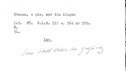 //// I //// Stanna, o pie, med din klagen //// 1:9. FÖ. S.L.S. 512 s. 564 nr 270. j //// N. ! //// 31. ; //// ÅBO. . //// sm*** j ////