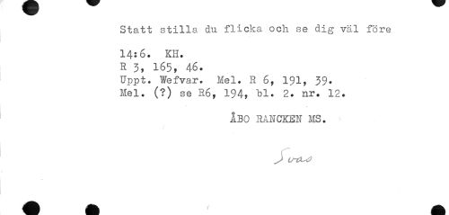 //// Statt stilla du flicka och se dig väl före //// 14:6. KH. K 3, 165, 46. //// Uppt. Wefvar. Mel. R 6, 191, 39. //// Mel. (?) se R6, 194, "bl. 2. nr. 12. //// ÅBO RAHCKEN MS. //// > u-tx^ //// / ////