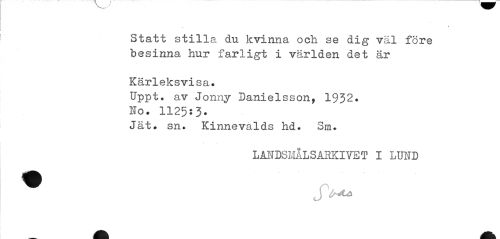 //// » //// Statt stilla du kvinna och se dig väl före besinna hur farligt i världen det är //// Kärleksvisa. //// Uppt. av Jonny Danielsson, 1932. lo. 1125:3* //// Jät. sn. Kinnevalds hd. 3m. //// LÅNDSMÅLSABKIYET I LUND ////