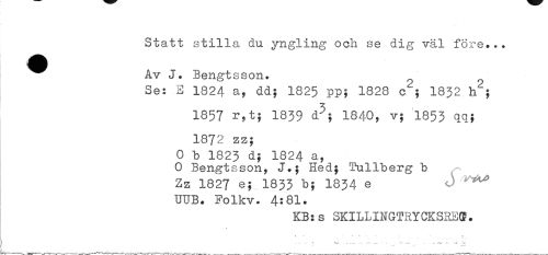 //// Statt stilla du yngling och se dig väl före... //// ^^ Av J. Bengtsson. //// Se: S 1824 a, dd; 1825 ppj 1828 c"; 1832 h2; //// 1857 r,tj 1859 d5; 1840, v$ 1855 qqj //// 1872 zz; //// 0 b 1825 d; 1824 a, //// 0 Bengt sson, J#j Hed} Tullberg b //// Zz 182? e; 1853 b; I834 e <3 //// UUB. Folkv. 4:81. //// t : ... j. t , //// .•• K»)- , ...• ---.. v. •-« "v ////