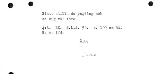 //// Statt stilla du yngling och se dig väl före //// 4:6. RE. S.L.S. 52. s. 120 nr 80. H. s. 174. //// ÅBO. //// J ////