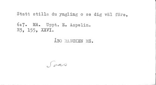 //// Statt stilla du yngling o se dig väl före, //// 6:7. MA. Uppt. S. Aspelin. 1 //// R3, 155, XXVI. //// ÅBO HANCKEN MS. //// J ////