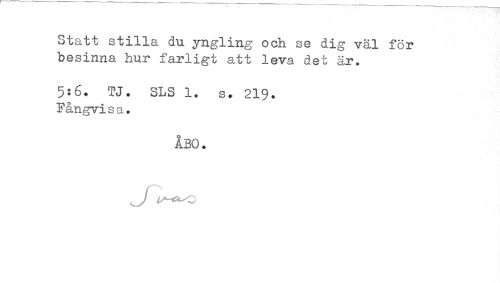 //// Statt stilla du yngling och se dig väl för besinna hur farligt att leva det är. //// 5:6. TJ. SLS 1. s. 219. //// Fångvi s a. //// ÅBO. //// ^J iAÄ/C ////