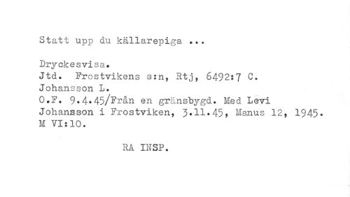 //// Statt upp du källarepiga ... Dryckesvisa. //// Jtd. Prostvikens s:n, Rtj, 6492:7 C. Johansson L. //// O.F. 9*4*45/Från en gränsbygd. Med Levi Johansson i Frostviken, 3.11.45? Manus 12, 1945* M ¥1:10. //// ra i1jsp. ////