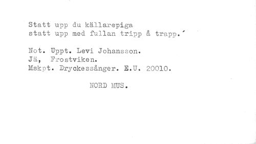 //// Statt upp du källarepiga //// statt upp med fullan tripp å trapp.' //// Hot. Uppt. Levi Johansson. //// Jä, Frostviken. //// Mskpt. Dryckessånger. E.U. 20010. //// « //// NORD MUS. ////
