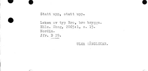 //// Statt upp, statt upp. ^^ Leken av typ Bro, bro brygga. //// Hals. Skog, 206551, s. 15. //// Nordin. Jfr. I) 29. //// ULM SÅNGLEKAR. ////