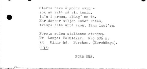 //// Stekta hara å gödda svin -sök nu rätt på sin kusin, ^^ ta'n i armen, släng' en in. //// Har dansar tiljan under foten, trampa lätt uppå skon, lägg imofen. //// Första raden utelämnas stundom. Ur Lampa: Folklekar. H:o 306 Å. Vg Kinne hd. Forshem. (Korsbärga). //// D Ti- //// NORD MUS. //// >>._.---T __. ^.J ---'-v-.-^-^k.---—-L,...»^,^--.,. __J---—---^ -J---«—---—--- ---—- , ////