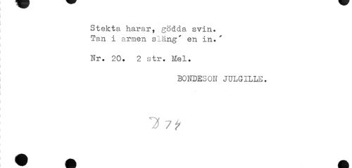//// Stekta, harar, gödda svin. Tan i armen släng' en in.' //// Hr. 20. 2 str. Mel. //// BONDESON JULGILLE. //// 1 7? ////