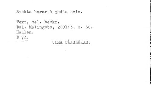 //// Stekta harar å gödda svin. I //// Text, mel. beskr. //// Dal. Malingsbo, 2001:3? s. 58. //// Hällen. t //// D 74- \ //// ---ULMA. SÅNGLEKAR. [ //// i //// i ¦ //// ¦ ////
