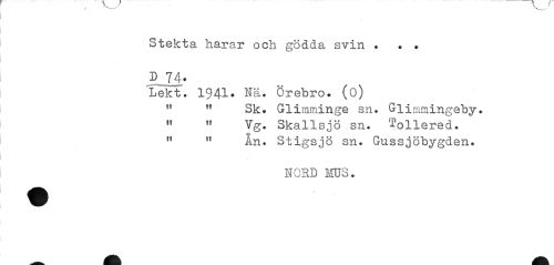//// Stekta harar och gödde* svin ? . . //// D 74. //// Lekt. 1941# Nä. Örebro, (o) //// " H Sk. Glimminge sn. Glimmingeby. //// 11 " Vg. Skallsjö sn. ?ollered. //// a //// " M Ån. Stigsjö sn. Gussjöbygden. //// HORD MUS. ////