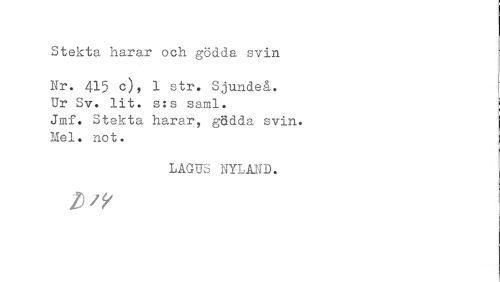 //// Stekta harar och gödda svin Kr. 415 c), i str. Sjundeå. //// Ur Sv. Iit. s:s saml. ! //// Jmf. Stekta harar, gödda. svin. Mel. not. //// LAGUS NYLAND. //// D'9 ////